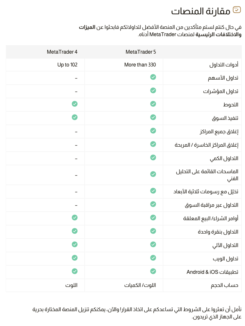 منصات التداول ميتاتريدر 4/ ميتاتريدر 5 20 فبراير، 2026 11:59 محدَّث اختر وحمّل منصة التداول MT4 أو MT5. اطلع على المقارنة من هنا. مقالات ذات صلة الخطوة 2. قم بتنزيل منصة التداول هل يوجد لديكم بونص ترحيبي؟ كم عدد حسابات التداول التي يمكنني فتحها من كل نوع؟ كيف أسجل الدخول إلى حسابي على منصة MetaTrader؟ أنواع الحسابات تعليقات لا توجد تعليقات المقال مغلق أمام التعليقات.