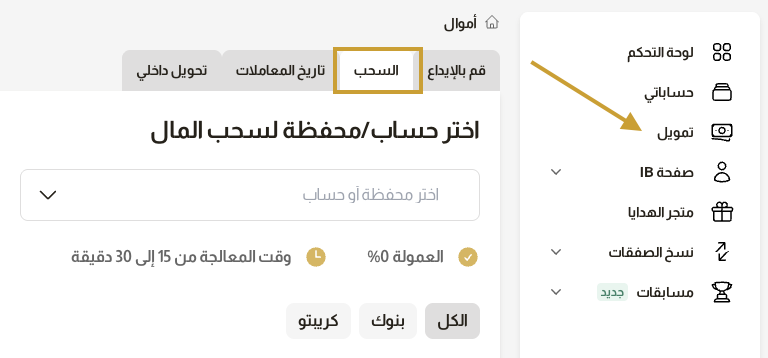 اختر الحساب أو المحفظة التي ترغب في السحب منها.