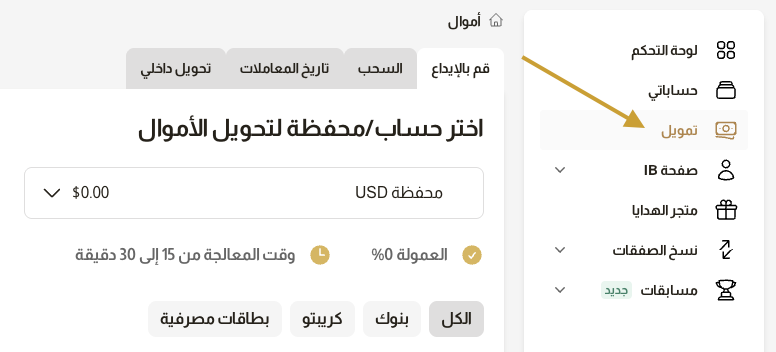 اختر المحفظة أو حساب التداول الذي ترغب في شحن رصيده.