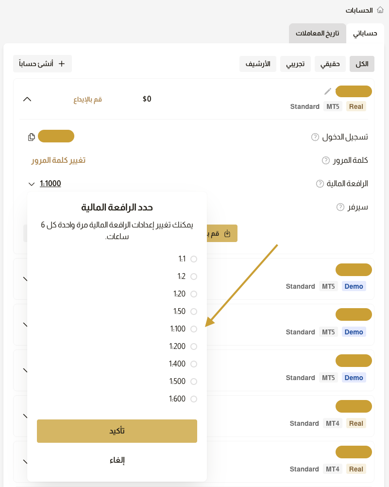 يدوياً: يمكن للمتداول تغيير الرافعة المالية للحساب يدوياً من منطقته الشخصية. اختر "حساباتي" (My Accounts) من القائمة الجانبية، ثم اختر الحساب المطلوب وانقر على "تغيير الرافعة المالية" (Change Leverage):
