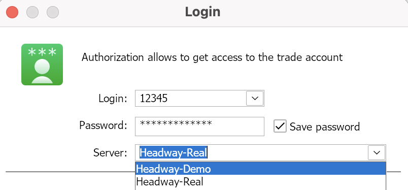 إذا كنت تقوم بتسجيل الدخول إلى حساب تجريبي (Demo)، اختر السيرفر: Headway-Demo.