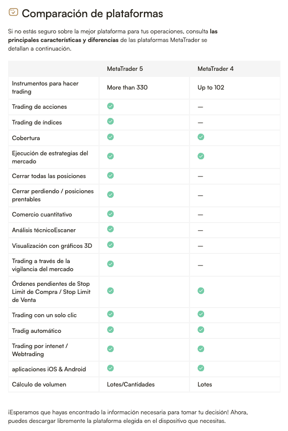 Plataformas de Trading MetaTrader4 / MetaTrader5 6 de marzo de 2026 13:21 Actualización Elije y descarga tu plataforma de Trading MT4 o MT5. Consulta la comparación aquí: Artículos relacionados Paso 2. Descargar la plataforma de trading ¿Tienes un bono de bienvenida? ¿Cuántas cuentas de trading de cada tipo puedo abrir? ¿Cómo ingresar a mi cuenta en la plataforma MetaTrader? Tipos de cuenta Comentarios 0 comentarios El artículo está cerrado para comentarios.