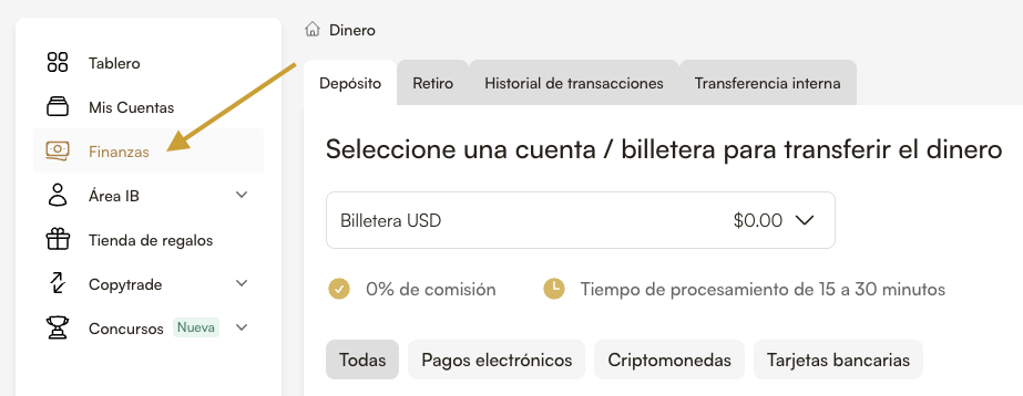 Haga clic en "Depósito" o "Finanzas" en su Tablero (Dashboard).