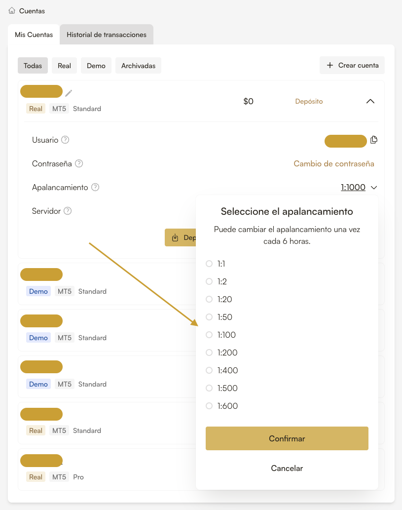 Seleccione "Mis cuentas" en el menú lateral, luego elija la cuenta y haga clic en "Cambiar apalancamiento":