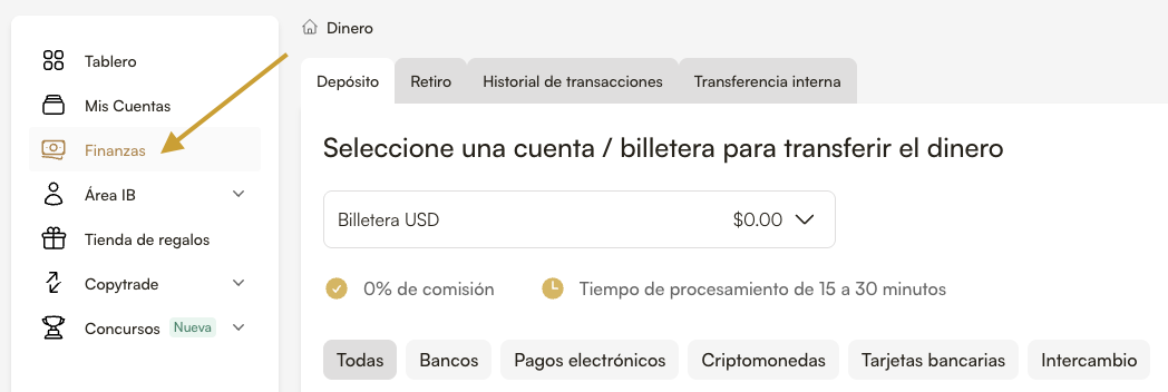 - Haga clic en "Depósito" o "Finanzas" en su Tablero (Dashboard).