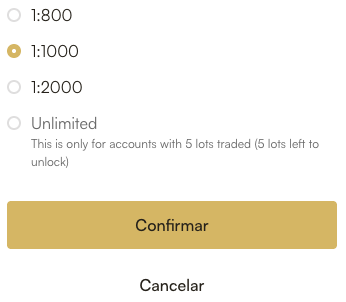 El apalancamiento ilimitado no está disponible cuando abre una cuenta por primera vez. El apalancamiento ilimitado está disponible después de hacer trading con 5 lotes (lotes de 500 cent).