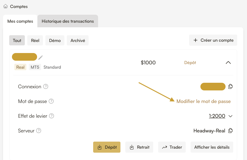 Lorsque vous ouvrez un compte de trading chez Headway, vous pouvez consulter votre numéro de compte et votre mot de passe ici : https://hw-af.online/user/accounts