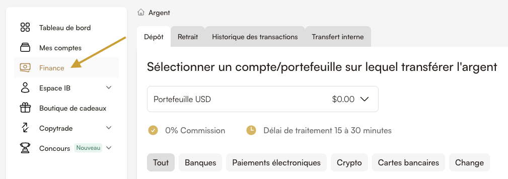 Cliquez sur « Dépôt » ou « Finances » sur votre tableau de bord.