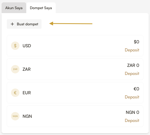 Anda dapat memiliki 1 dompet untuk setiap mata uang.