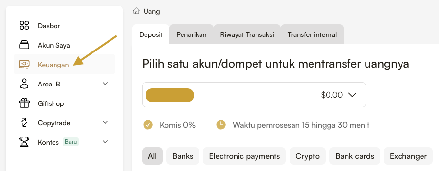 - Klik "Deposit" atau "Finance" pada Dashboard Anda.