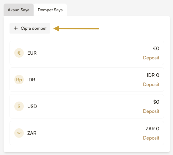 Anda boleh menambah dompet baharu pada Papan Pemuka (Dashboard) di dalam Kawasan Peribadi anda sekiranya perlu.