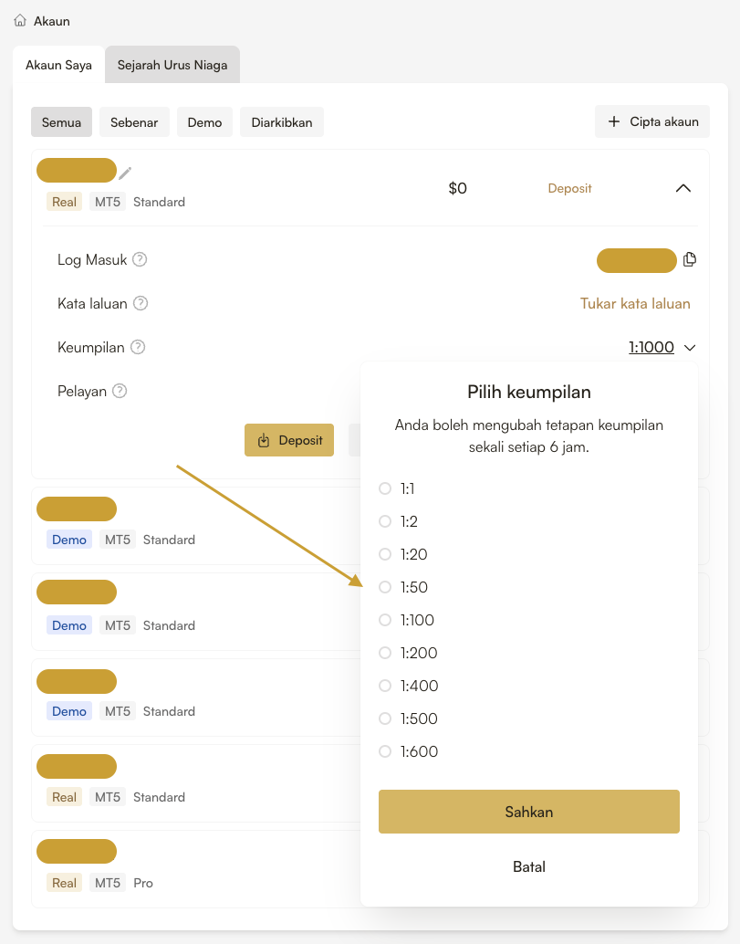 Pilih "Akun Saya" di menu samping dan selanjutnya pilih akun dan klik pada "Ubah Leverage":