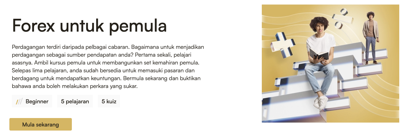 Ikuti kursus Forex untuk pemula kami. Kursus ini mengandungi lima pelajaran dan kuiz yang direka untuk pedagang baharu. Penulisnya ialah Nourleeden El Hammoury, seorang pedagang dan pelabur bertaraf dunia yang mempunyai kepakaran selama 15 tahun dalam bidang Pasaran Pertukaran Asing.