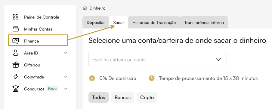 Escolha a sua Conta/Carteira de onde pretende levantar os fundos.