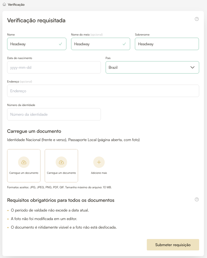 Notas: * O documento carregado deve conter o nome completo do cliente.