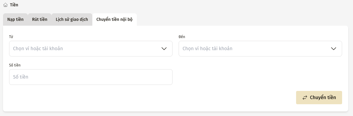 Bạn cũng có thể chuyển tiền nội bộ giữa các ví. Để chuyển tiền nội bộ: