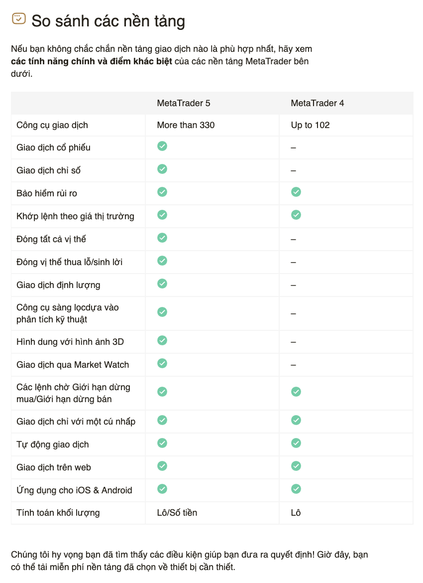 Các nền tảng giao dịch MetaTrader4/MetaTrader5 14:37 Ngày 13 tháng 03 năm 2026 Đã cập nhật Chọn và tải xuống nền tảng giao dịch MT4 hoặc MT5. Xem so sánh tại đây. Bài viết liên quan Bước 2. Tải xuống nền tảng giao dịch Bạn có phần thưởng chào mừng không? Tôi có thể mở bao nhiêu Tài khoản giao dịch mỗi loại? Làm thế nào để đăng nhập vào tài khoản của tôi trên nền tảng MetaTrader? Các loại tài khoản Bình luận 0 bình luận Bài viết bị đóng bình luận.