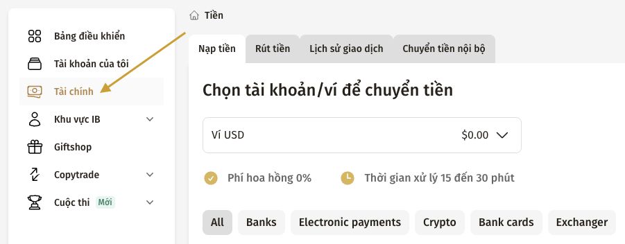 - Chọn ví hoặc tài khoản giao dịch mà bạn muốn nạp tiền.