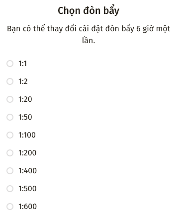 Xin lưu ý rằng đòn bẩy cao hơn mang đến cơ hội kiếm lợi nhuận cao hơn nhiều nhưng đồng thời cũng làm tăng rủi ro. Xem bài viết về Ký quỹ.