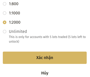 Đòn bẩy không giới hạn không khả dụng khi bạn mở tài khoản lần đầu tiên. Đòn bẩy không giới hạn trở nên khả dụng sau khi bạn giao dịch 5 lô (500 lô cent).